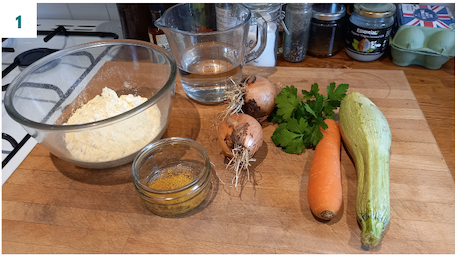 Grate 2 onions or chop as finely as you can and leave to one side. Do the same with whatever veg needs using up… here we’ve used a courgette and carrot.